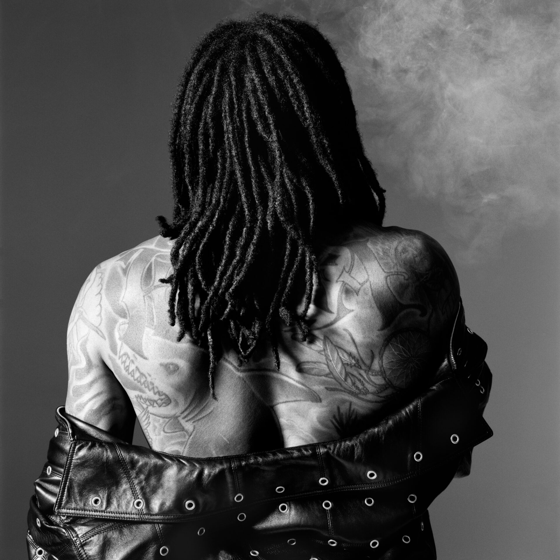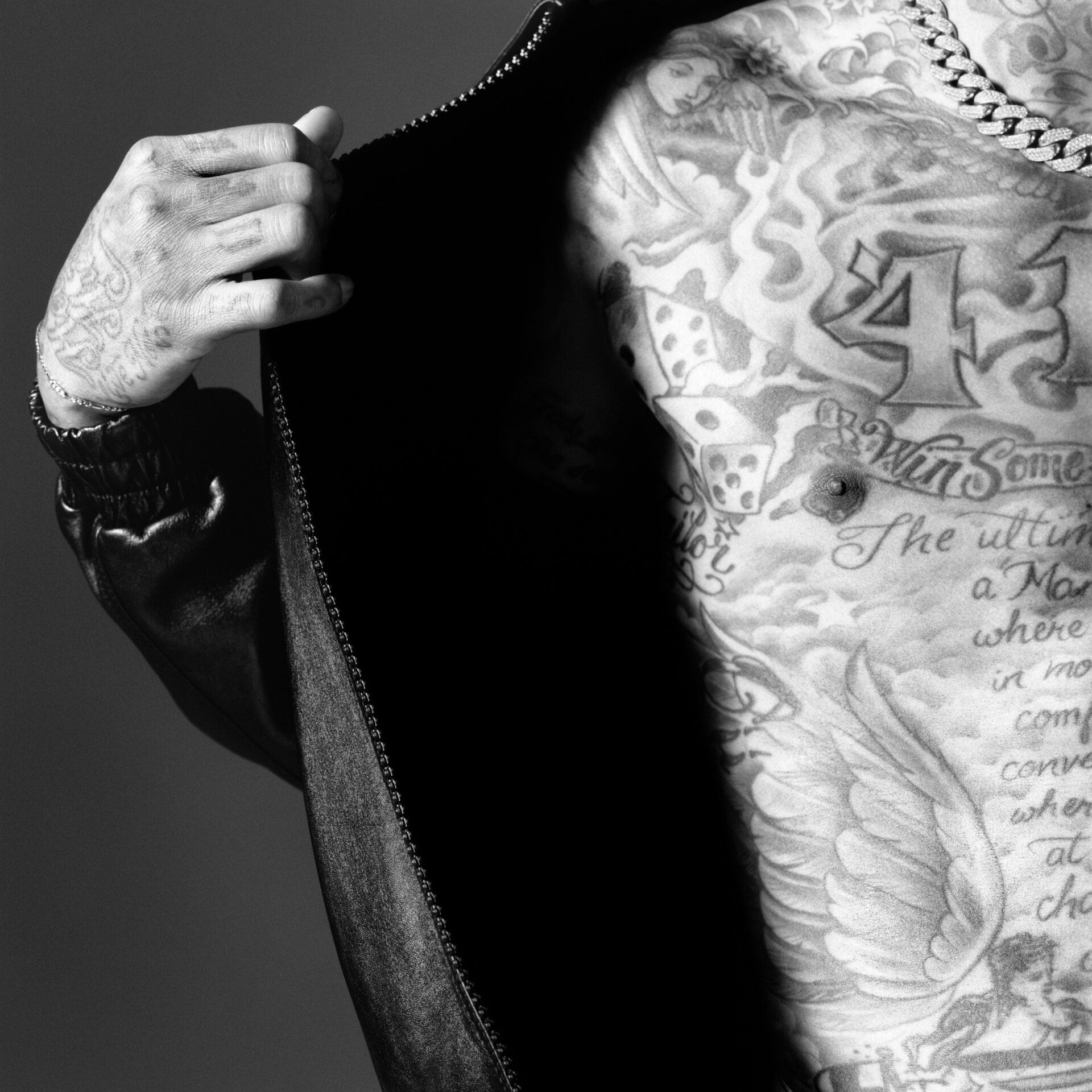 All’interno del progetto fotografico viene data poi particolare importanza ai tatuaggi del rapper, che si mescolano armoniosamente con la scelta cromatica “black/white” su cui affonda le proprie radici estetiche l’intero lookbook.